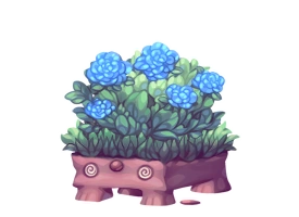 The Bleugras resembles a small brown square planter with four squat legs and two spiral, hypnotized eyes below a tiny round nose. Its planter body is filled with green grass and many light blue flower buds.