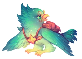 The Book Owl resembles a blue bird with lighter blue feet and a deeper blue color at the end of its feathers. It wears round golden spectacles and a brown leather backpack. The overall effect is of studious curiousity.