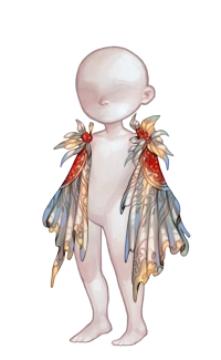 Celestial Basilisk Cloak resembles a white, non-hooded cloak with golden embroidery that falls to the avatar's knees. It is fastened at the avatar's shoulders with white feathers that have a scarlet gem in the middle, which matches a scarlet patch of ornate fabric at each shoulder.