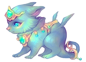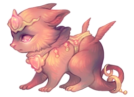 The Clerical Dragoncat resembles a pink quadrupedal cat with small, rabbitlike ears. It wears a soft gold crown and collar with pink inset gems and a harness of the same color. Two gold rings circle its long tail and it has a pair of small wings on its haunches.