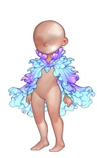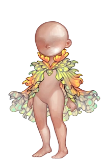 Clione's Cloak is a high-necked leafy cloak that flows to the avatar's rear. The Common variant is pink and blue, the Uncommon variant is lilac and light blue, the Rare variant is scarlet, and the Alchemy variant is gold.