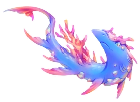 The Dread Fin resembles a cute grey shark with orange rock formations sporadically attached to it and an orange hue at the tip of its tail.