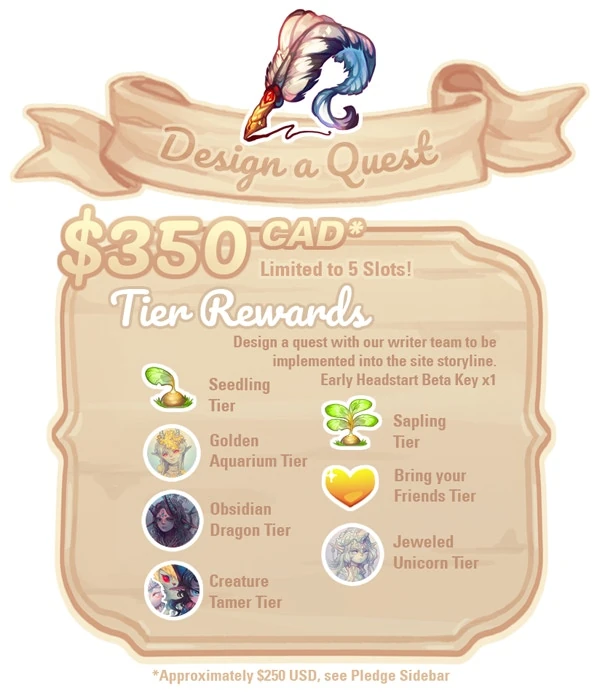 The Design a Site Pet Tier allowed the backers to design a pet with site artists to be implemented on-site in some way. This is similar to the Custom Pet Maker tier, though the differences are that it's an official site pet, and it's not unique: the pet is attainable by all users.
