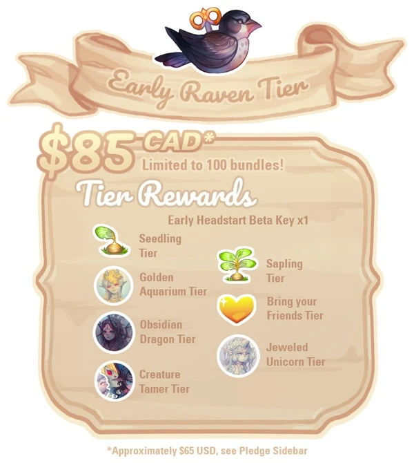 According to the Kickstarter, "This is the second limited Early Bird pledge tier. As well as getting a headstart, it also includes all non-limited digital rewards up to Creature Tamer, allowing for a very complete digital package for collectors." 100 were available for the price of $85 (CAD) each. These rewards sold out in less than a minute into the Kickstarter.