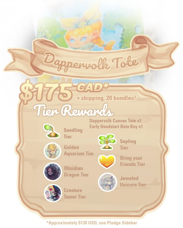 This tier will allow you to collaborate with our staff to design an item that will be integrated into the world of Dappervolk, complete with its own stat bonuses and description! You can choose to create either a totem or a pet food. We will work with you to ensure that the item fits into the world of Dappervolk and does not unbalance the game (some limitations will apply). Your username and ID will also be featured in the item's description. - Dappervolk Kickstarter