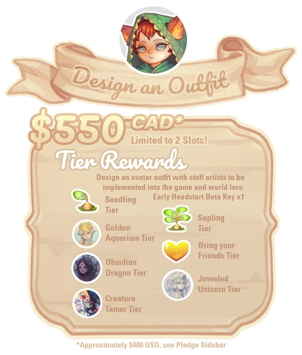 The Custom Clothing Maker Tier, similar to the Custom Pet tier before it, allowed backers to work with site artists to design and create a unique custom piece of clothing. This piece of clothing is not available to all users, there is only one copy for the backer themselves.The design is based on keywords or images provided (with restrictions). The Custom Clothing Maker items will be available on site, though will be very rare (less than 1% chance of winning one through a gacha). There were 5 available for $135 (CAD) each, which were all claimed.