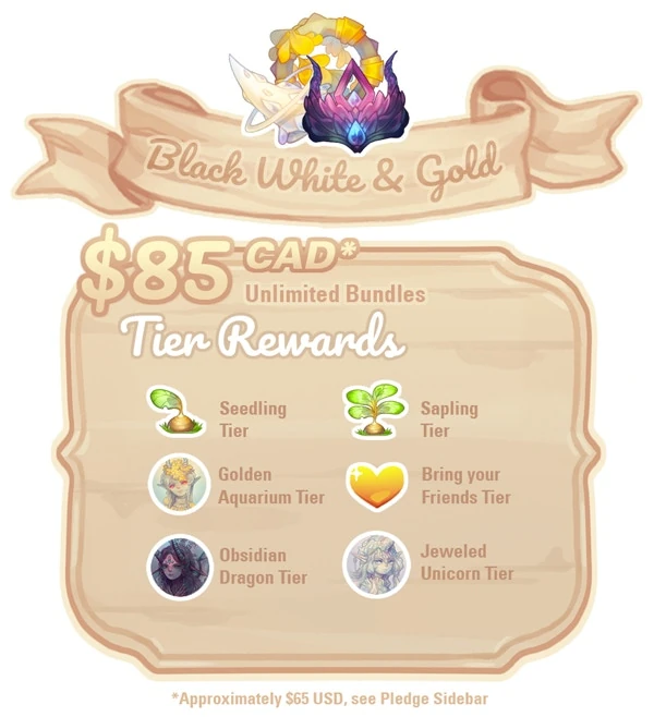 The Jeweled Unicorn tier had an "opulent, bejeweled kingdom" aesthetic. This tier includes the recipe to the legendary rarity Jeweled Unicorn pet, which can be gotten via pet alchemy. There is a full pet, item, and clothing preview page on the Dappervolk Tumblr .This tier was unlimited. 42 backers purchased this tier for $65 (CAD) each.