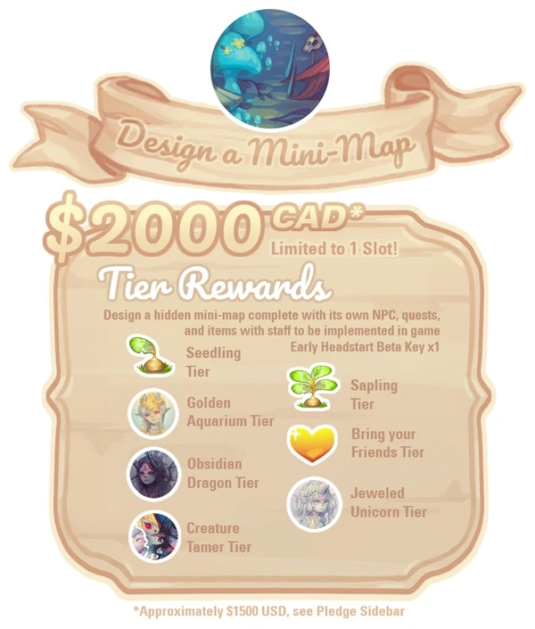 The Design A Mini-Map tier was the most expensive tier available, at $2,000 (CAD). There was only one available, which was claimed. According to the Kickstarter, "this tier is for those who wish to truly Kickstart our project as well as contribute some major content to the game! Design a hidden mini-map with staff, complete with its own NPCs, stories, shops, and items!"