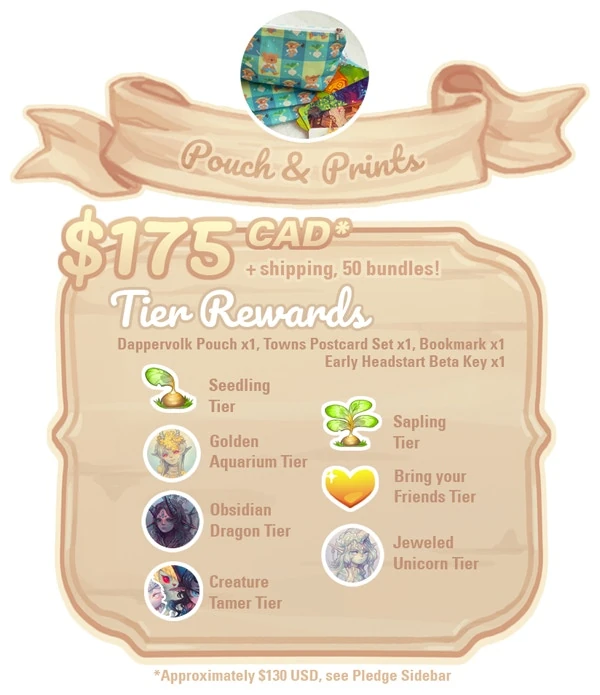 The Pouch & Prints Tier included a Bearnard pouch, postcards, and a bookmark. The pouch is inspired by the Turnip Thief minigame and includes similar sprites. There are full prints and a pouch preview page on the Dappervolk Tumblr. There were 50 available for $175 each. It is the only limited tier where all available slots weren't backed: 36 out of the 50 were claimed.