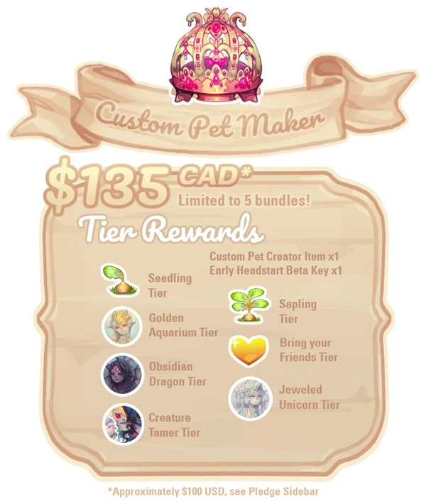 The Custom Pet Maker Tier allowed backers to be able to work with site artists to design and create a unique custom pet. This pet will not be available to all users, there is only one copy for the backer themselves. The design is based on keywords or images provided (with restrictions). The Custom Pet Maker items will be available on site for future users to get custom pets, though will be very rare (less than 1% chance of winning one through a Chance Machine (gacha)). This tier was in extremely high demand and sold out within seconds of the Kickstarter opening. There were 5 available for $135 (CAD) each.