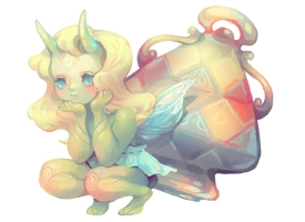 The Lantern Pixie is a humanoid pet with pale skin that ranges from pinkish to yellow-green. It has blue eyes, two horns on its forehead, long yellowish hair, and bluish wings. It is wearing a pale blue skirt. On its back is a large multicolored lantern.