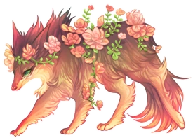 The Meadow Hound resembles a pink-orange quadrupedal hound with a long tail and foxlike ears, covered in delicate pink flowers.