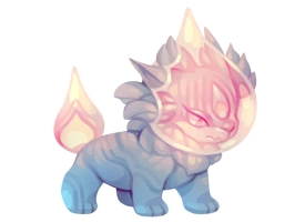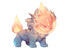 The Ruin Lion looks like a small stout stone cat in shades of light grey. Its face peers out from behind a reddish transparent shield, similar to a flame, and its tail has a similar flame on the end of it. The evolution is much more gold-toned.